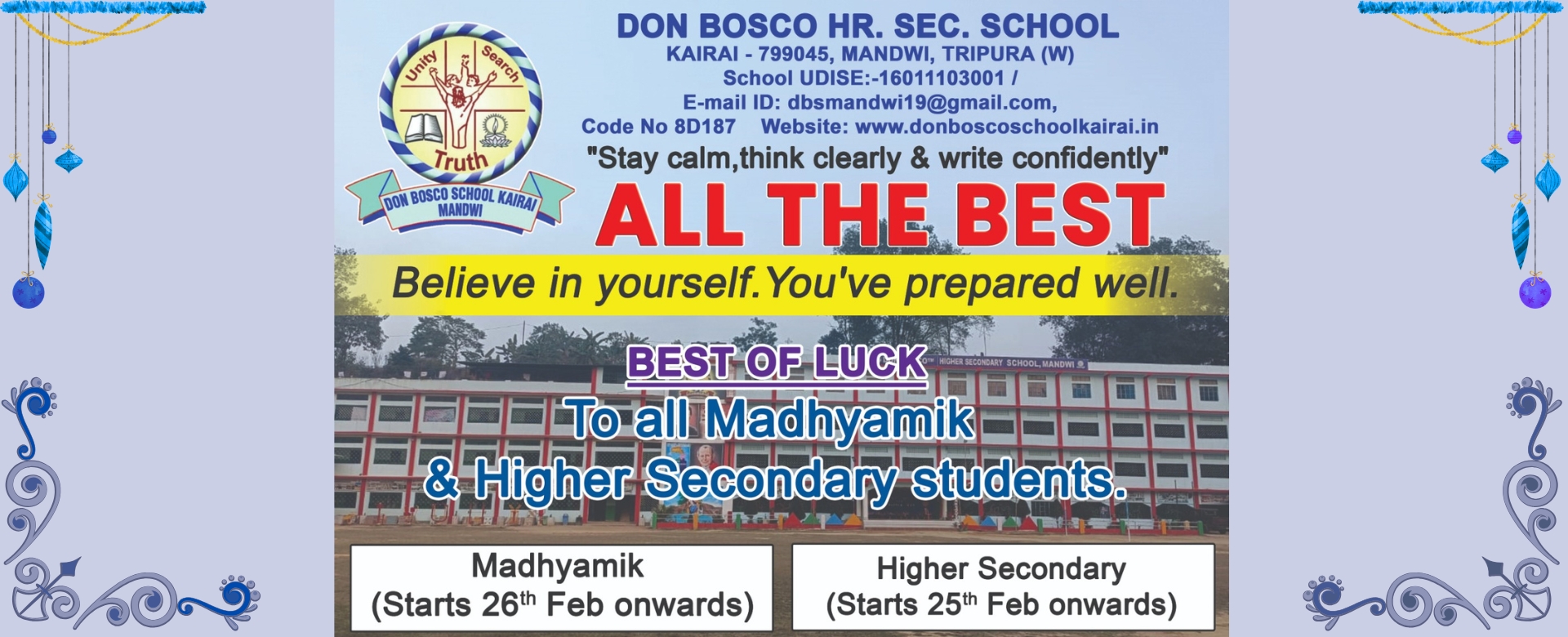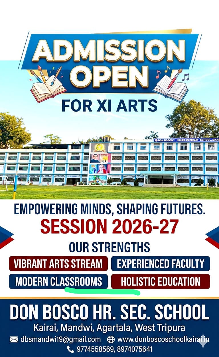 Don Bosco Higher Secondary School, Kairai, Mandwi established in 2009 is a co-educational English Medium Minority Christian Educational Institution owned and run by the Salesians of Don Bosco. The School is recognised by the Govt.of Tripura and is affiliated to Tripura Board of Secondary Education(TBSE).The system of education followed in